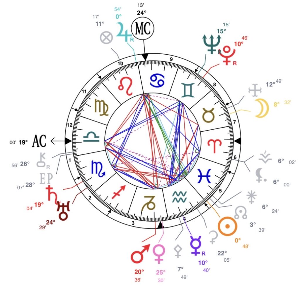 - Pluton conjoint Neptune en Gémeaux (Maison IX) : C’est ici que naît l’écriture automatique. Neptune (l’inspiration) et Pluton (les profondeurs de l’inconscient) s’unissent dans le signe de la communication (Gémeaux) pour explorer les contrées lointaines de l’esprit. Neptune étant le maître de son Soleil, cette configuration domine toute son œuvre.